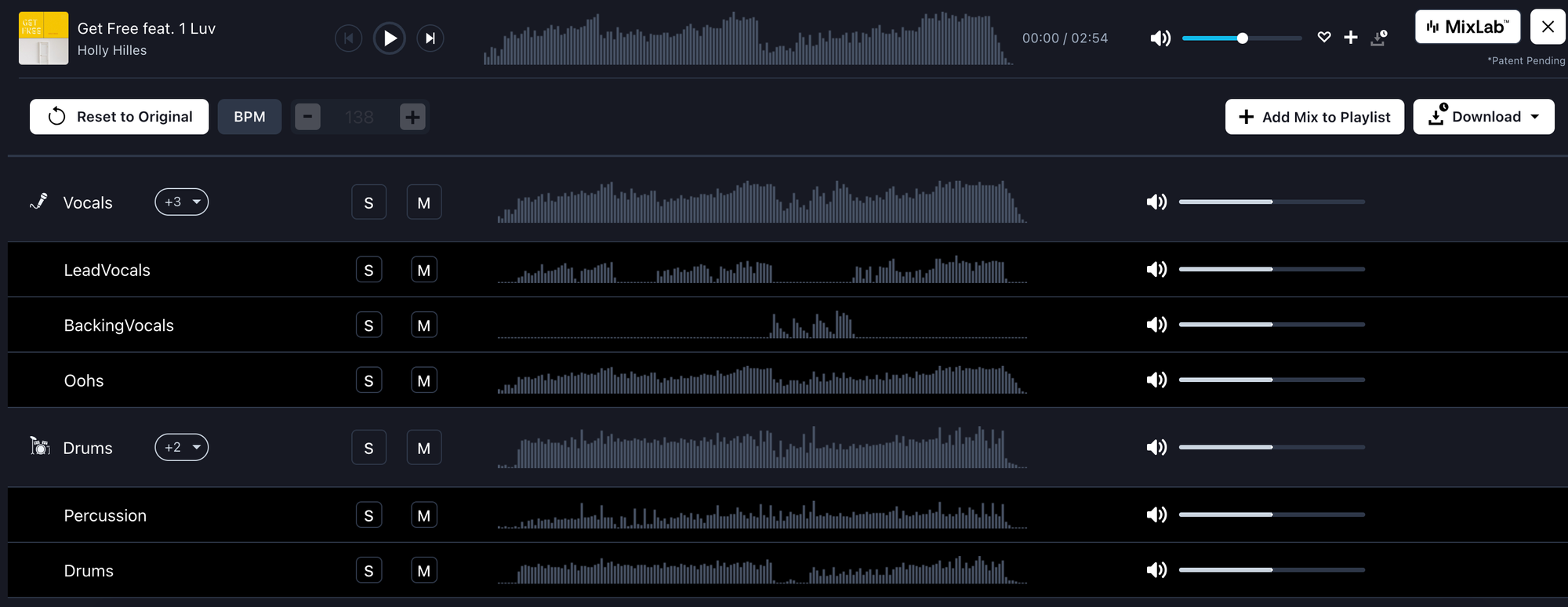 Use the S button to solo a specific stem, or the M button to mute a stem you don't want to hear in the mix.